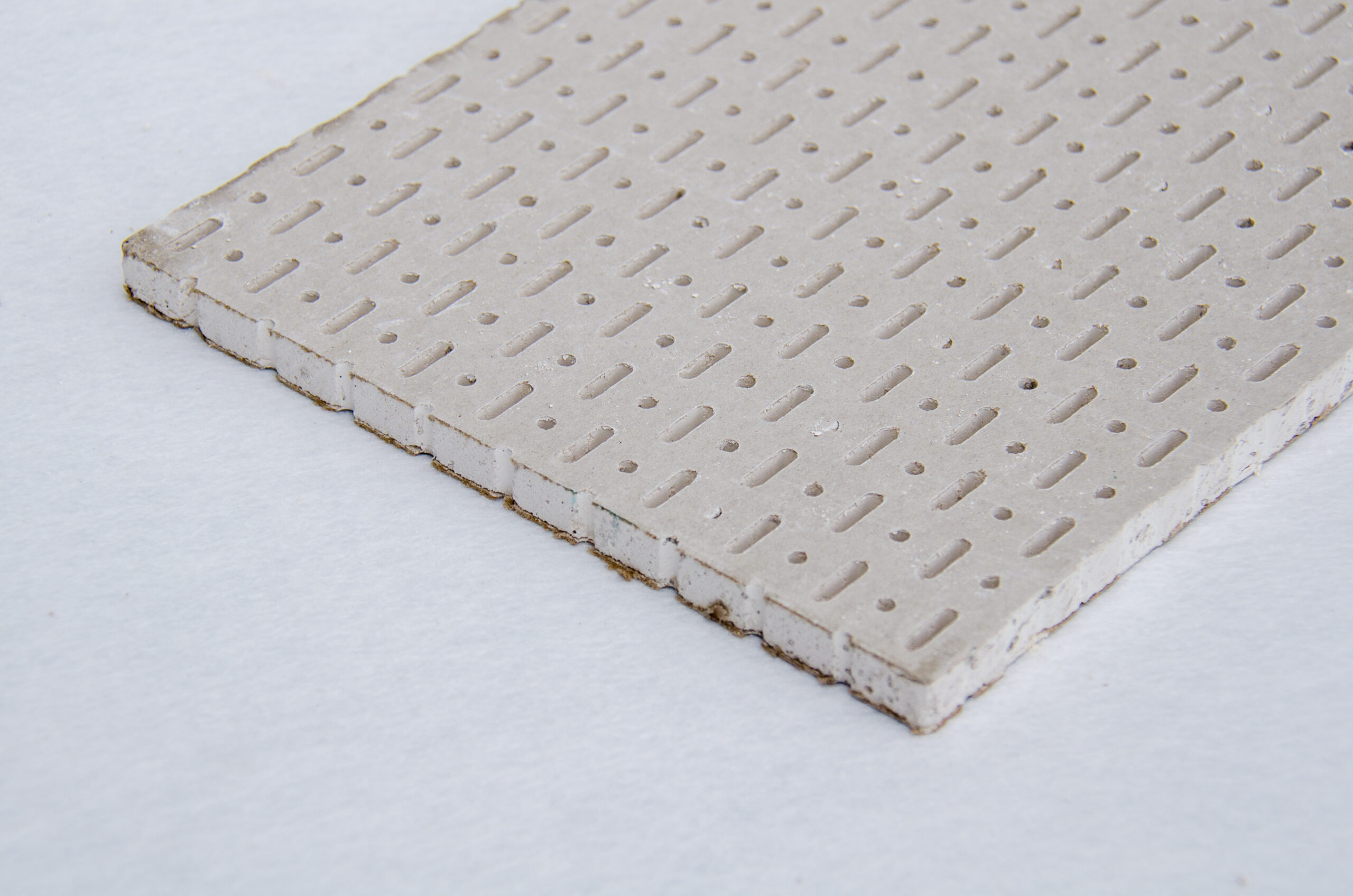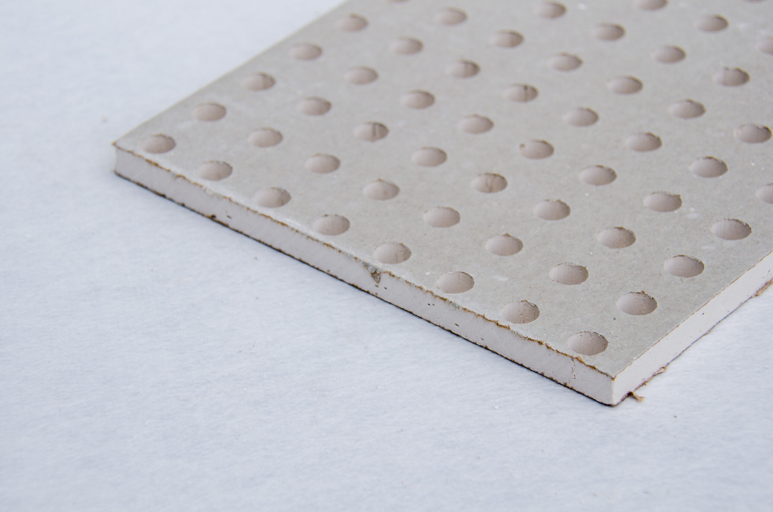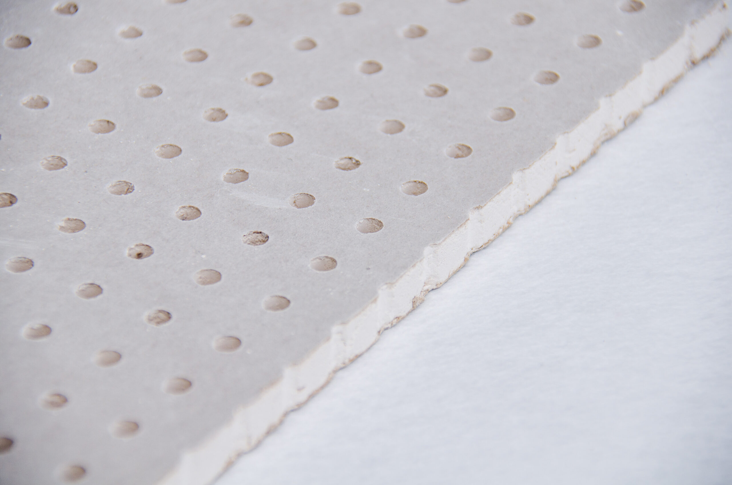 Perforated gypsum panels integrate acoustic performance into drywall systems for seamless interior finishes.