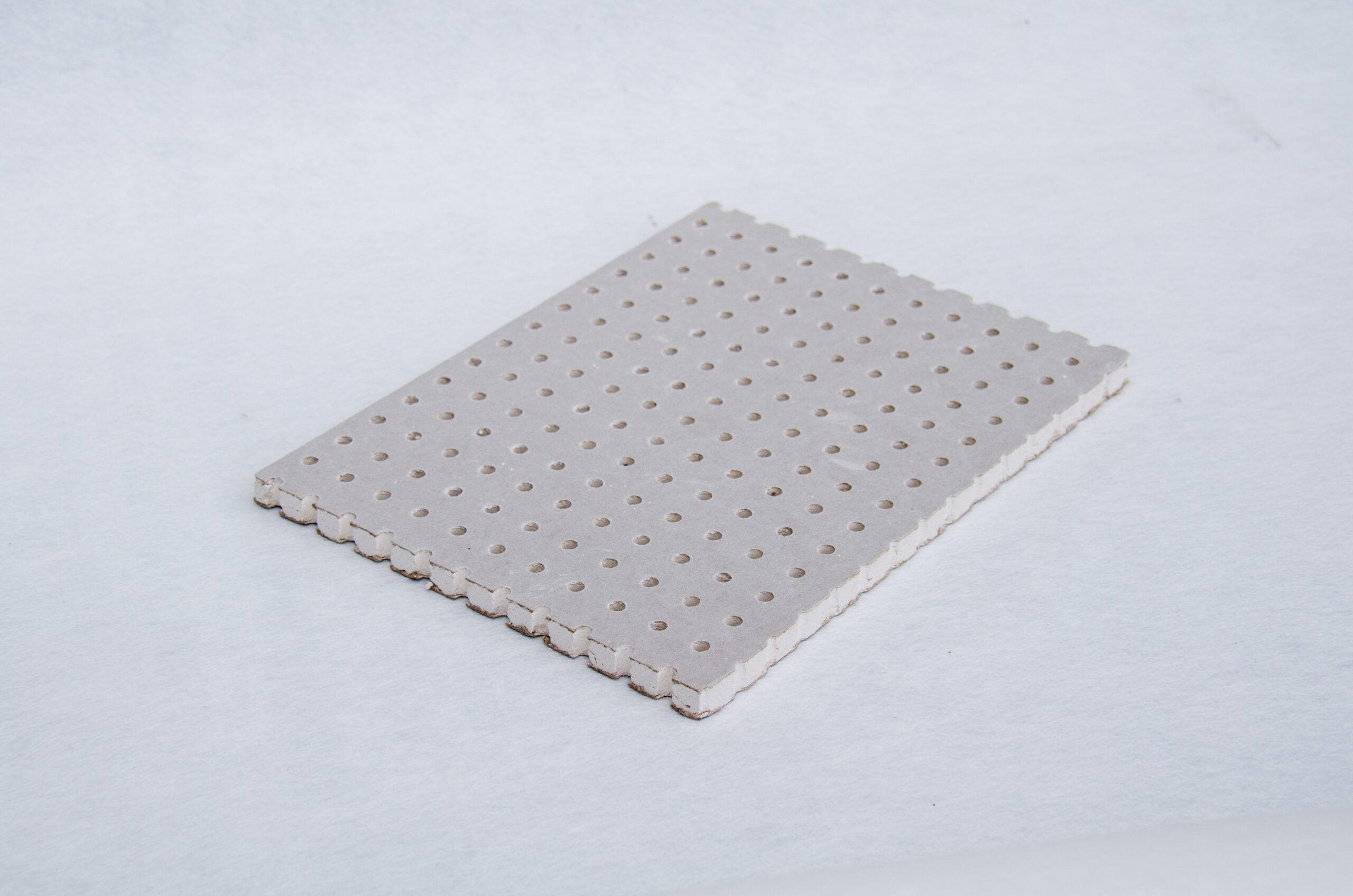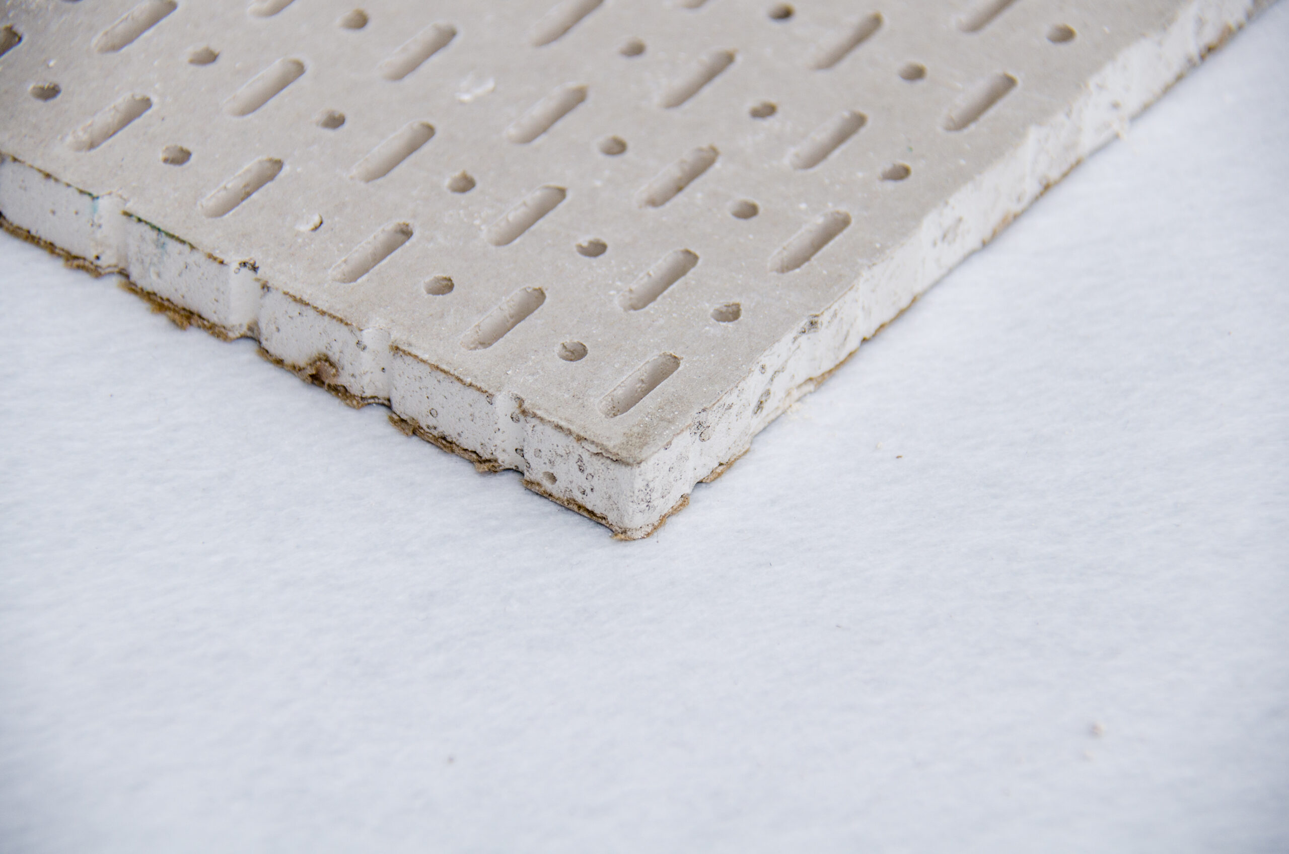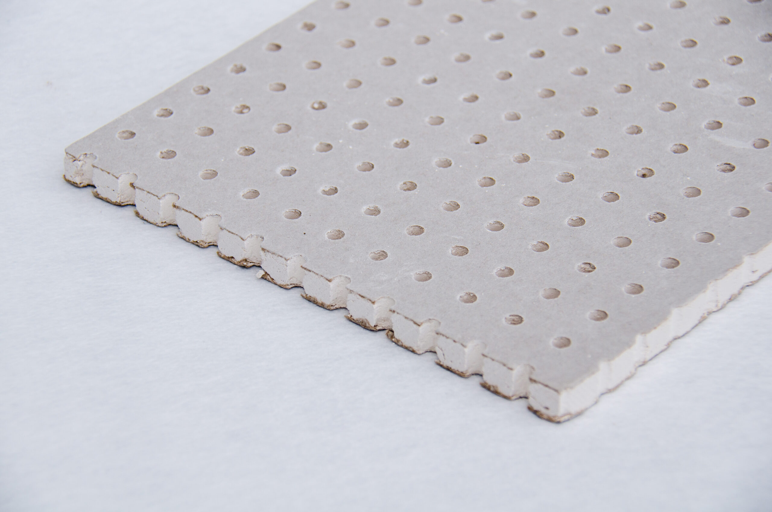 Perforated gypsum panels integrate acoustic performance into drywall systems for seamless interior finishes.